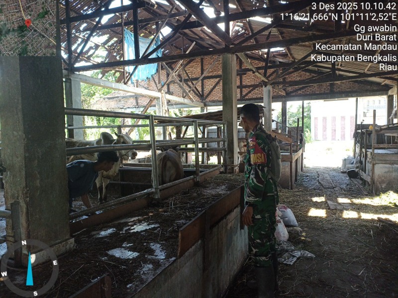 Untuk antisipasi hal tersebut, Kodim 0303/Bengkalis melalui Koramil 03/Mandau Babinsa Sertu Robbi, terus melaksanakan kegiatan pemantauan Penyakit Mulut dan Kuku (PMK) hewan ternak sapi di Jalan Tribrata Kelurahan Duri Barat, Kecamatan Mandau, Kabupaten Bengkalis, Rabu (03/12/2025).