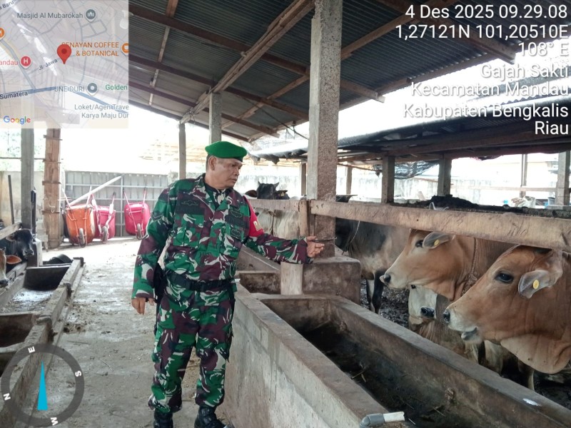 Untuk antisipasi hal tersebut, Kodim 0303/Bengkalis melalui Koramil 03/Mandau Babinsa Sertu Robbi, terus melaksanakan kegiatan pemantauan Penyakit Mulut dan Kuku (PMK) hewan ternak sapi di Jalan Tribrata Kelurahan Duri Barat, Kecamatan Mandau, Kabupaten Bengkalis, Kamis (04/12/2025).