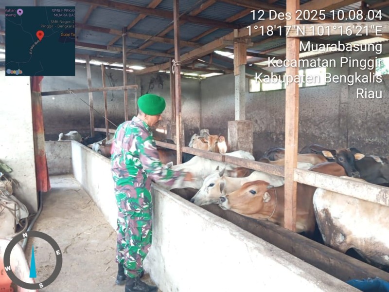Untuk antisipasi hal tersebut, Kodim 0303/Bengkalis melalui Koramil 03/Mandau Babinsa Pelda Suprapto terus melaksanakan kegiatan pemantauan Penyakit Mulut dan Kuku (PMK) hewan ternak sapi di Desa Muara Basung, Kecamatan pinggir Kabupaten Bengkalis, Jumat (12/12/2025).