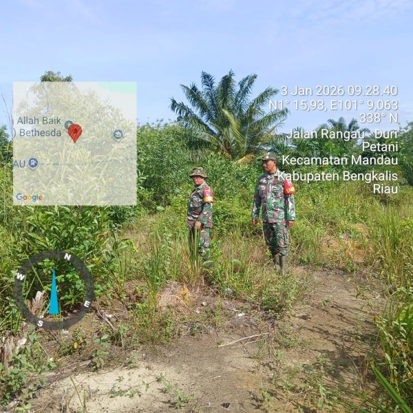 Babinsa 03/Mandau Serma Agus w prabowo, Sertu Rosdianto, Serda D.Simanjuntak Berpatroli di Desa Petani, Batsol, Bengkalis, Riau, Sabtu (03/01/2026) pagi.