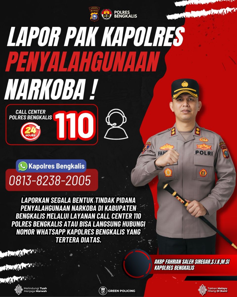 “Laporkan segala bentuk tindak pidana penyalahgunaan narkoba di Kabupaten Bengkalis. Masyarakat bisa menghubungi Call Center Polres Bengkalis di nomor 110 atau langsung ke WhatsApp Kapolres Bengkalis, "demikian bunyi imbauan tersebut.