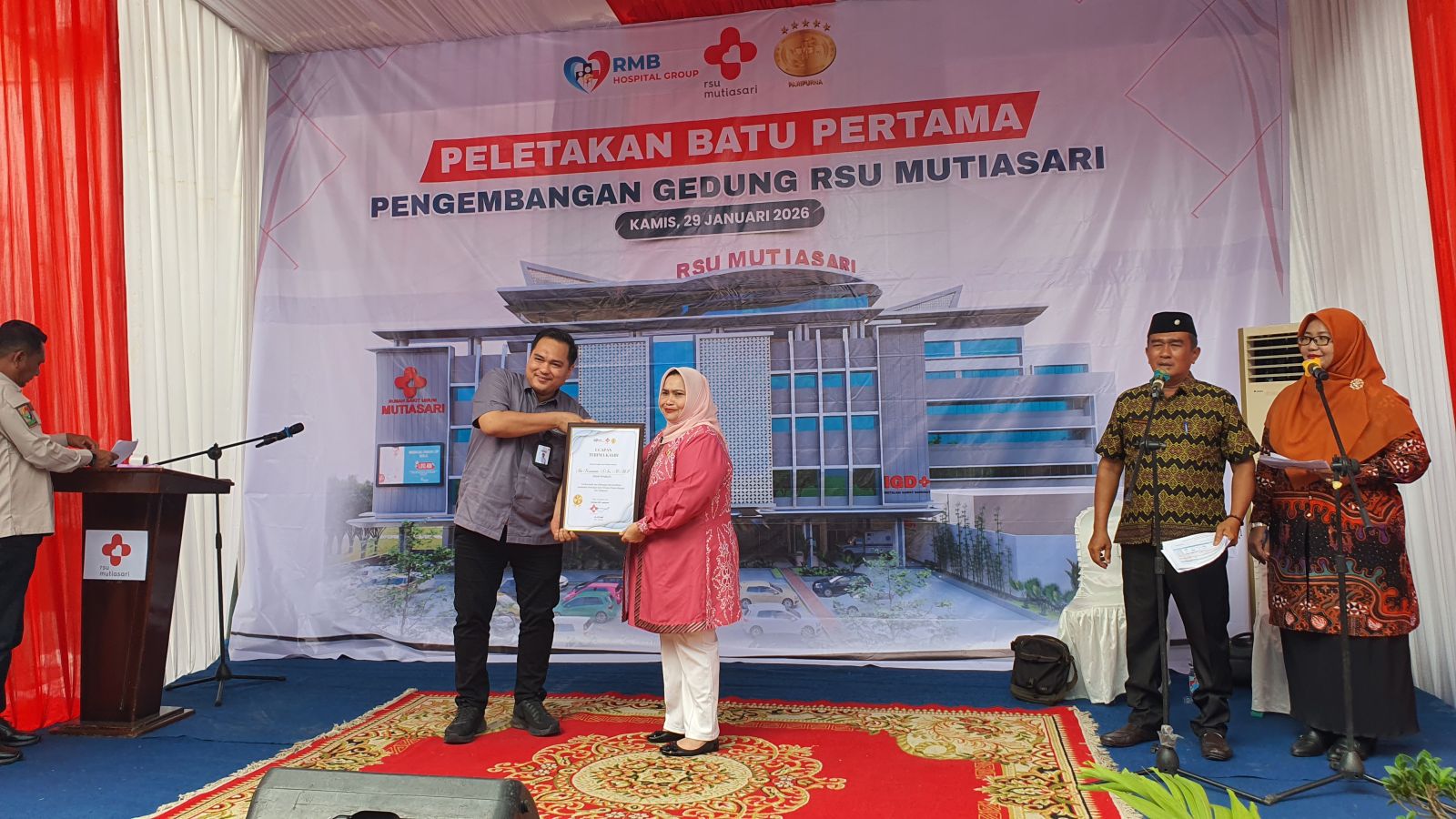 Peletakkan batu pertama RSU Mutia sari dilaksanakan pada Kamis (29/01/2026) dihadiri oleh Bupati Bengkalis Kasmarni, CEO RMB Doni Adelino, Ketua LAMR Mandau Zulfan Efendi, Wakil Ketua I M. Arsya Fadila, Kapolsek Mandau Kompol Primadona, Camat Mandau Riki Rihardi, Direktur RSU Mutia Sari dr. M. Yusuf.