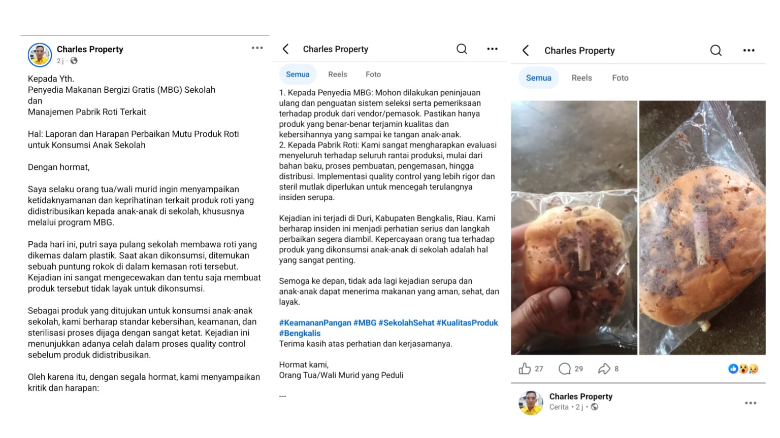 Unggahan tersebut dibagikan oleh akun Facebook bernama Charles Property, yang mengaku sebagai orang tua murid. Dalam keterangannya, ia menyampaikan keprihatinan mendalam atas kondisi roti yang diterima putrinya sepulang sekolah. Kejadian ini terjadi di wilayah Duri, Kabupaten Bengalis, Kecamatan Mandau.